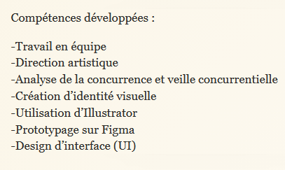Pour la partie compétences, la taille est portée à 18, afin de renforcer leur visibilité et leur importance. Ces compétences correspondent aux savoir-faire développés et consolidés grâce aux projets réalisés.