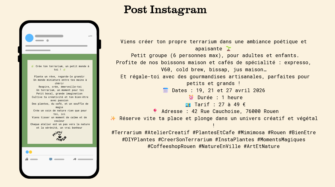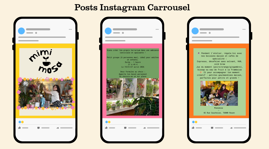 J’ai créé différents types de contenus pour Mimimosa : des carrousels (publications composées de plusieurs images que l’on peut faire défiler), des posts uniques et une affiche. Ces supports permettent à Migueline, la responsable, de mettre en avant les prix et les dates des ateliers de manière claire et attractive pour sa clientèle. Chaque visuel a été conçu pour respecter l’identité chaleureuse et créative de Mimimosa, tout en restant lisible et impactant sur les réseaux sociaux.