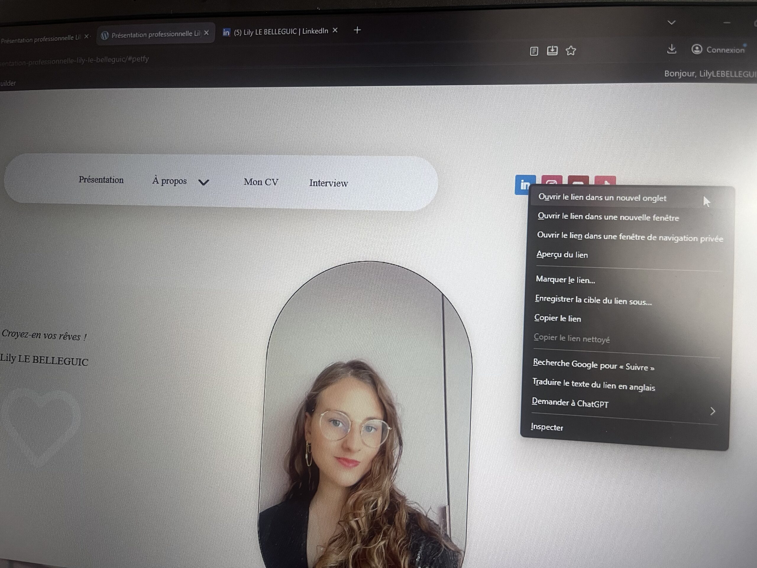 En cliquant sur l’un de mes réseaux, Divi permet d’ouvrir le lien dans un nouvel onglet, ou dans le même, pour arriver sur le réseau social souhaité (ici Linkedin).