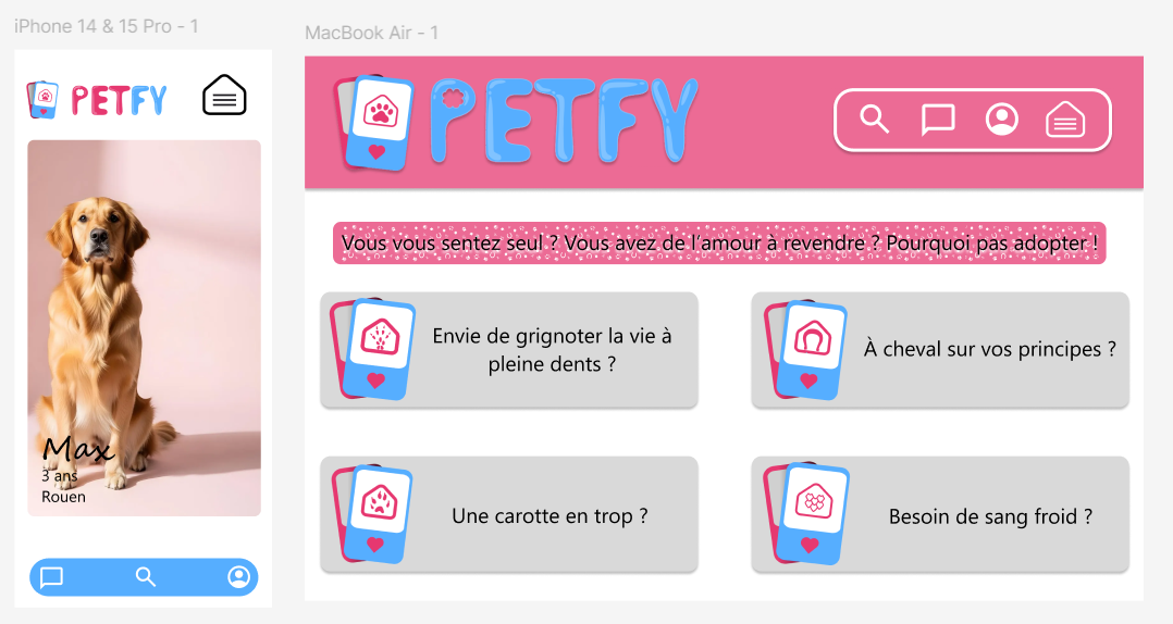 En parallèle, nous avons réalisé une veille concurrentielle afin d’analyser les applications d’adoption animale déjà existantes, d’identifier leurs points forts et leurs limites, et de positionner Pet’Fy de manière cohérente.