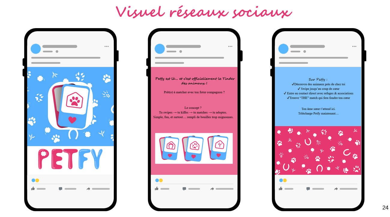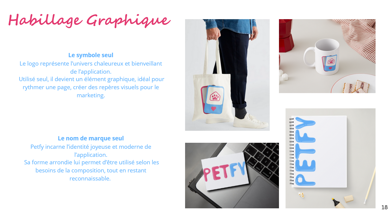 Dans le cadre d’un projet professionnel, nous avons travaillé en groupe sur la création complète de l’identité visuelle d’une application fictive nommée Pet’Fy, destinée à une cliente réelle. Pet’Fy est une application dédiée à l’adoption de tous types d’animaux. L’objectif était de concevoir un projet de A à Z, en répondant à un brief précis. La cliente a beaucoup apprécié le résultat final.
