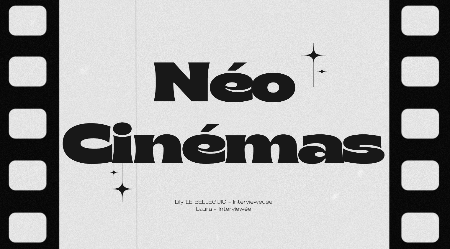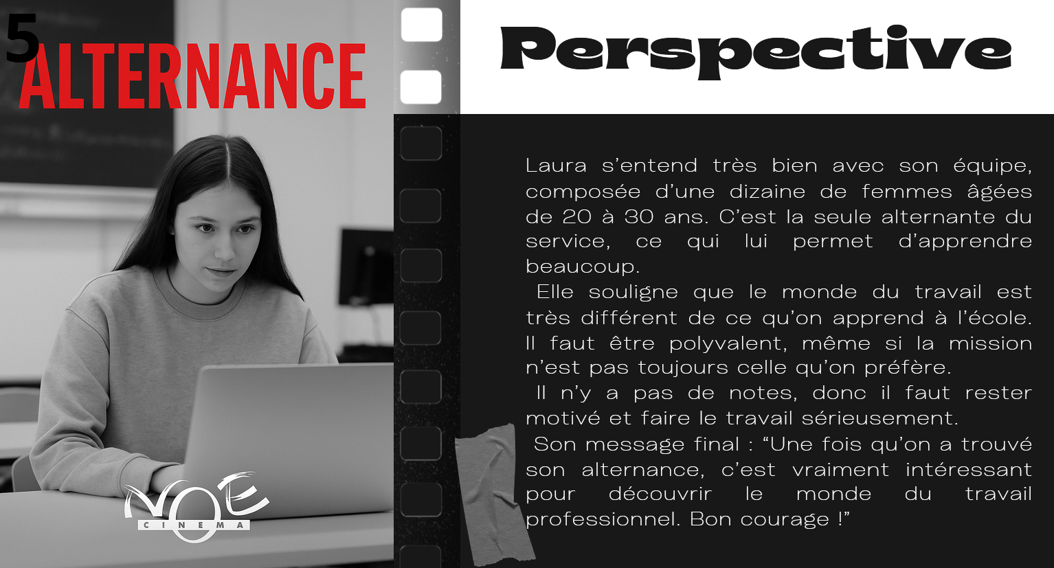 J’ai interviewé Laura, qui travaille en alternance chez Néo Cinéma. À partir de ses réponses, j’ai conçu un diaporama présentant son parcours et son expérience. Le visuel devait être en cohérence avec son domaine d’activité et son univers professionnel.